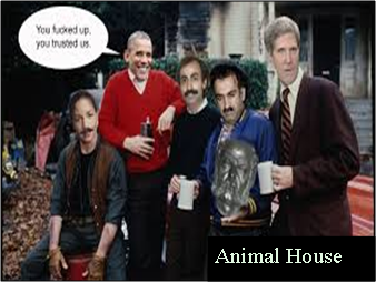 Anyway this kid Johnny came in the other night at closing time and told me he was joining the army and apologized for this lewd behavior on the deck and how he had no right to jack his parents card the way he had and had felt bad about it ever since. I told him to look at the bright side that since he was leaving college for the army he wouldn’t accrue all that student loan debt and now be he would be able to move out of his parent’s home and buy his own home before his fiftieth {50th} birthday. He laughed and then said that he hoped he didn’t get shot and I said but if you do make sure it’s not a vital organ especially that one and pointed to his boom stick and then said: and if that happens you can come home and apply for permanent social security disability and be set for life. Thank you President Obama! I mean Bill I think I talked him out of incurring needless college debt especially when I see these girls with a University of Miami degree in hand applying here for a cocktail job. Sara cups her hands around her mouth and lowers her voice an octave and emitting some crackling outer space radio noises then blurts out: Paging Donna Shalala: Animal House called and they want their football team back; countrywide called and they want their below rate loans back [202] and the young University of Miami alumni called and they want their money and lost youth back.